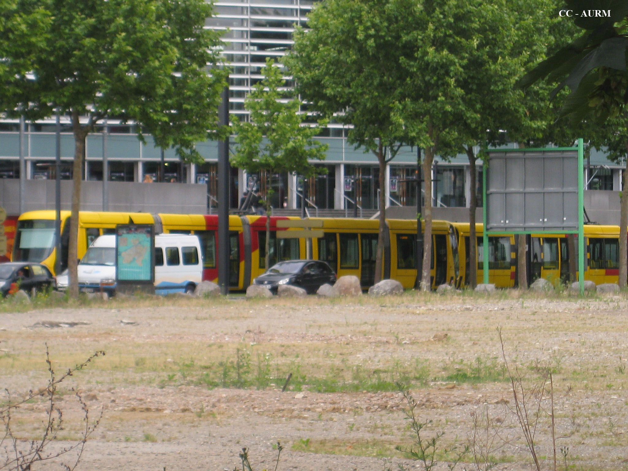 tramway. arbre. bâtiment. terrain vague.