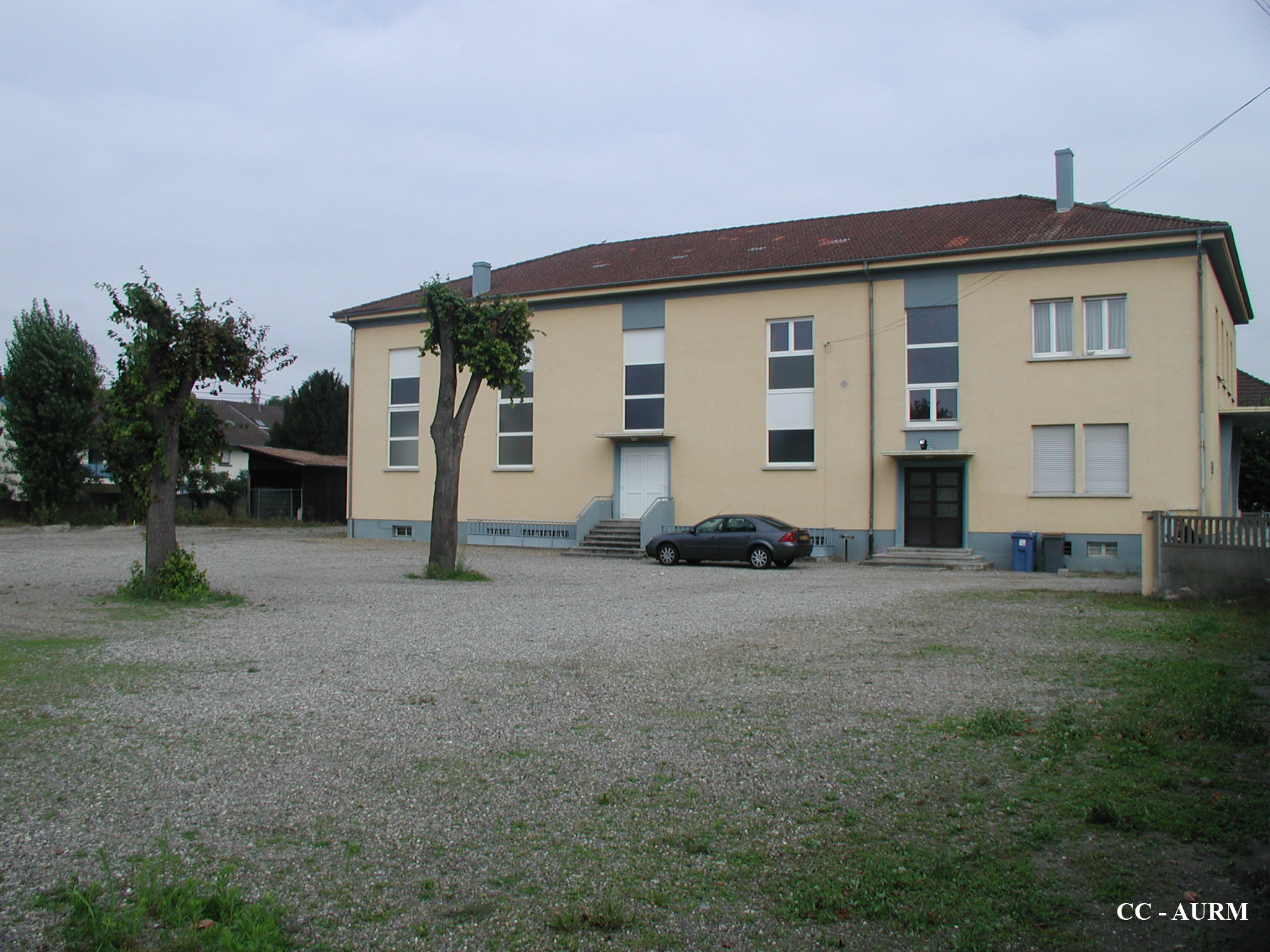 bâtiment. cour. arbre.