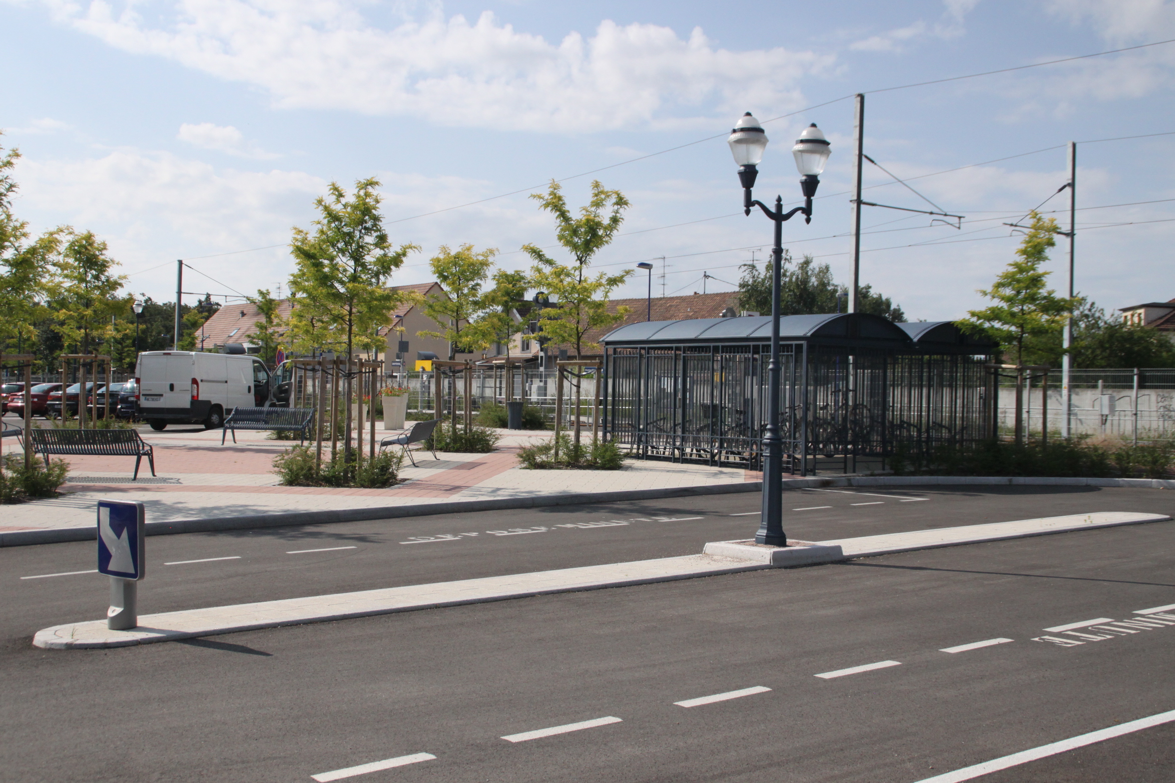 Station TramTrain. Parking. Banc. Arbre.