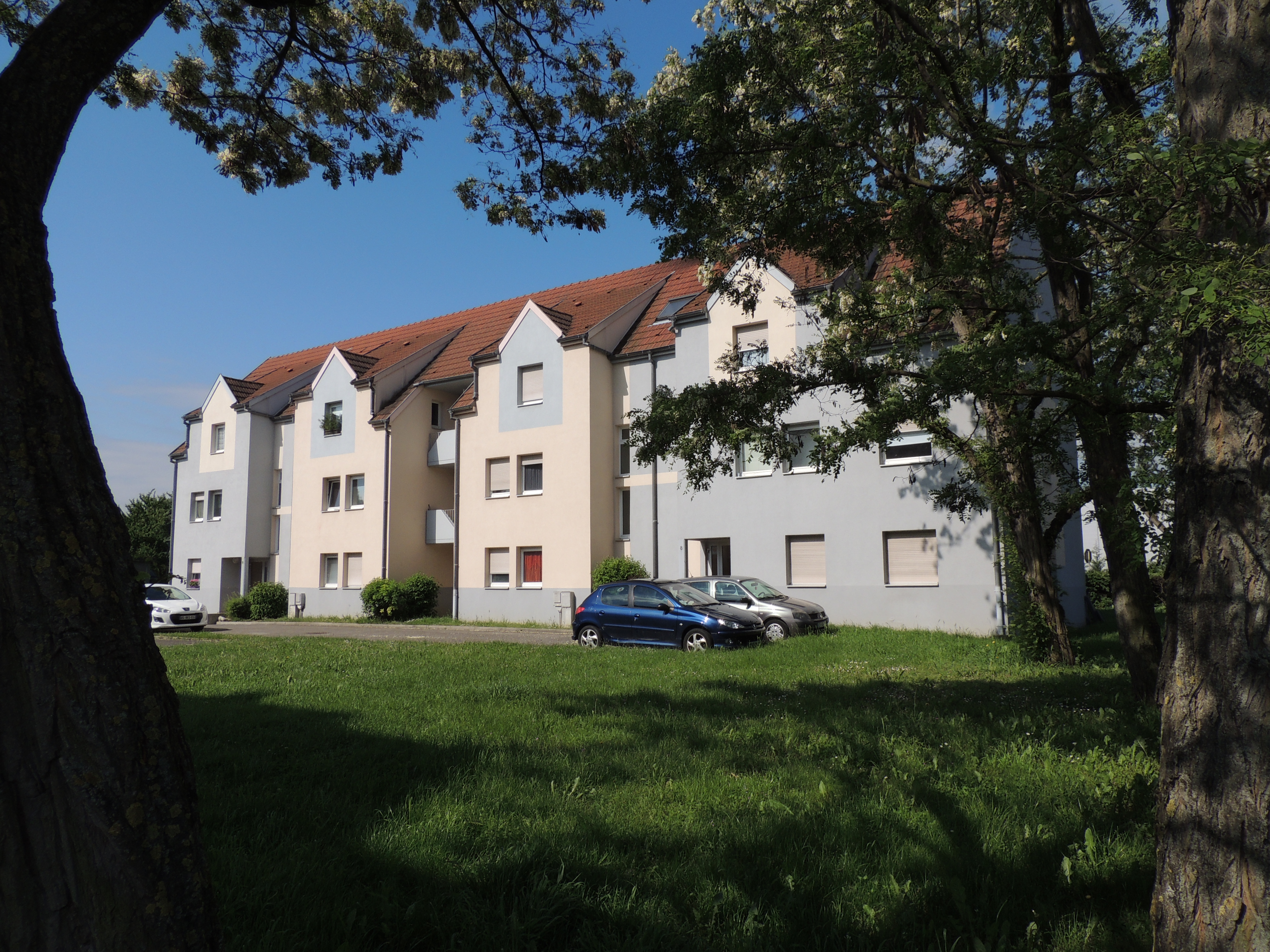 Lotissement. Habitations. Voiture. Arbre.