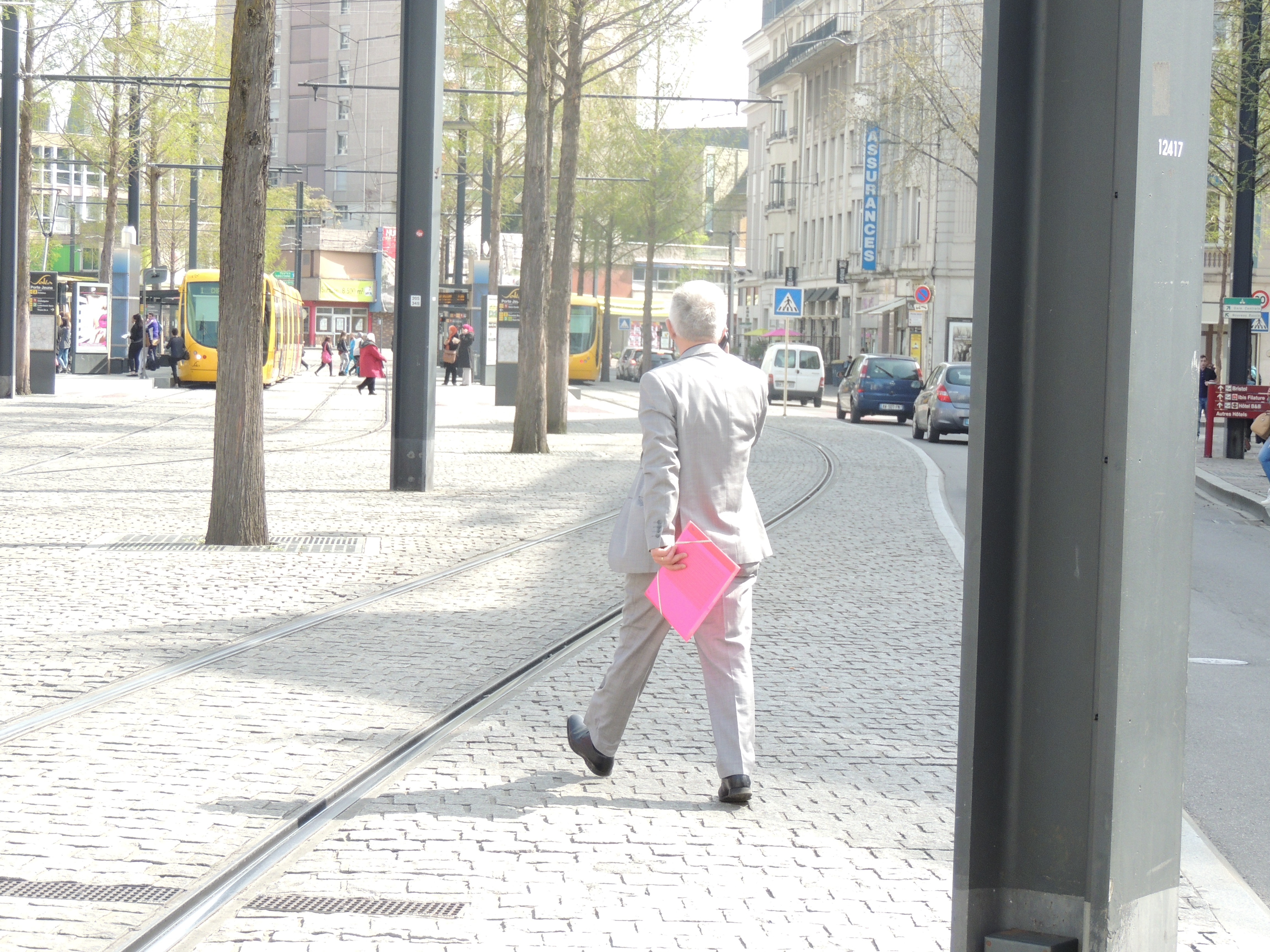 Personne marchand au niveau des rails du tram à Porte Jeune.