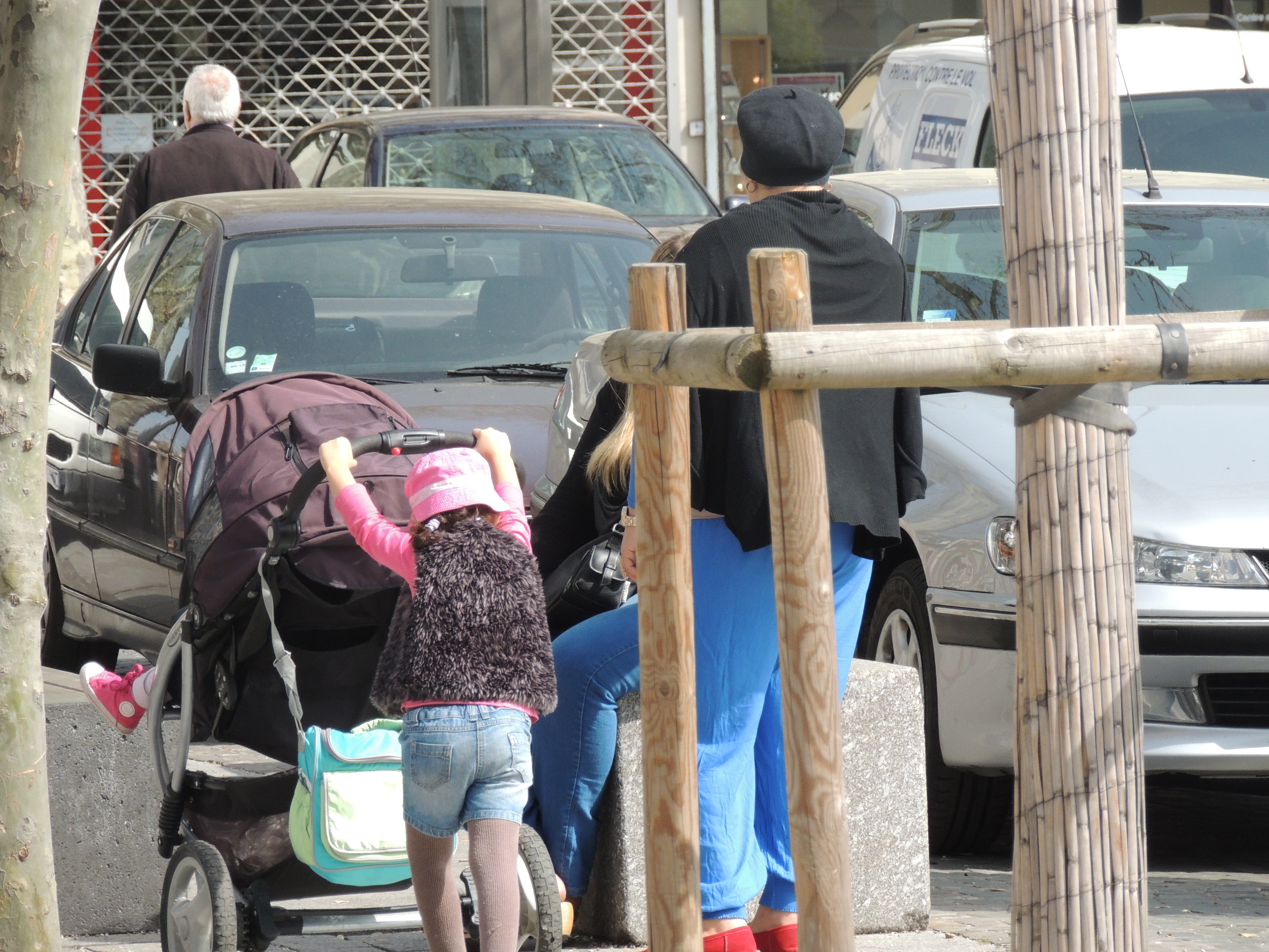 Femme et enfants se déplaçant en ville.
