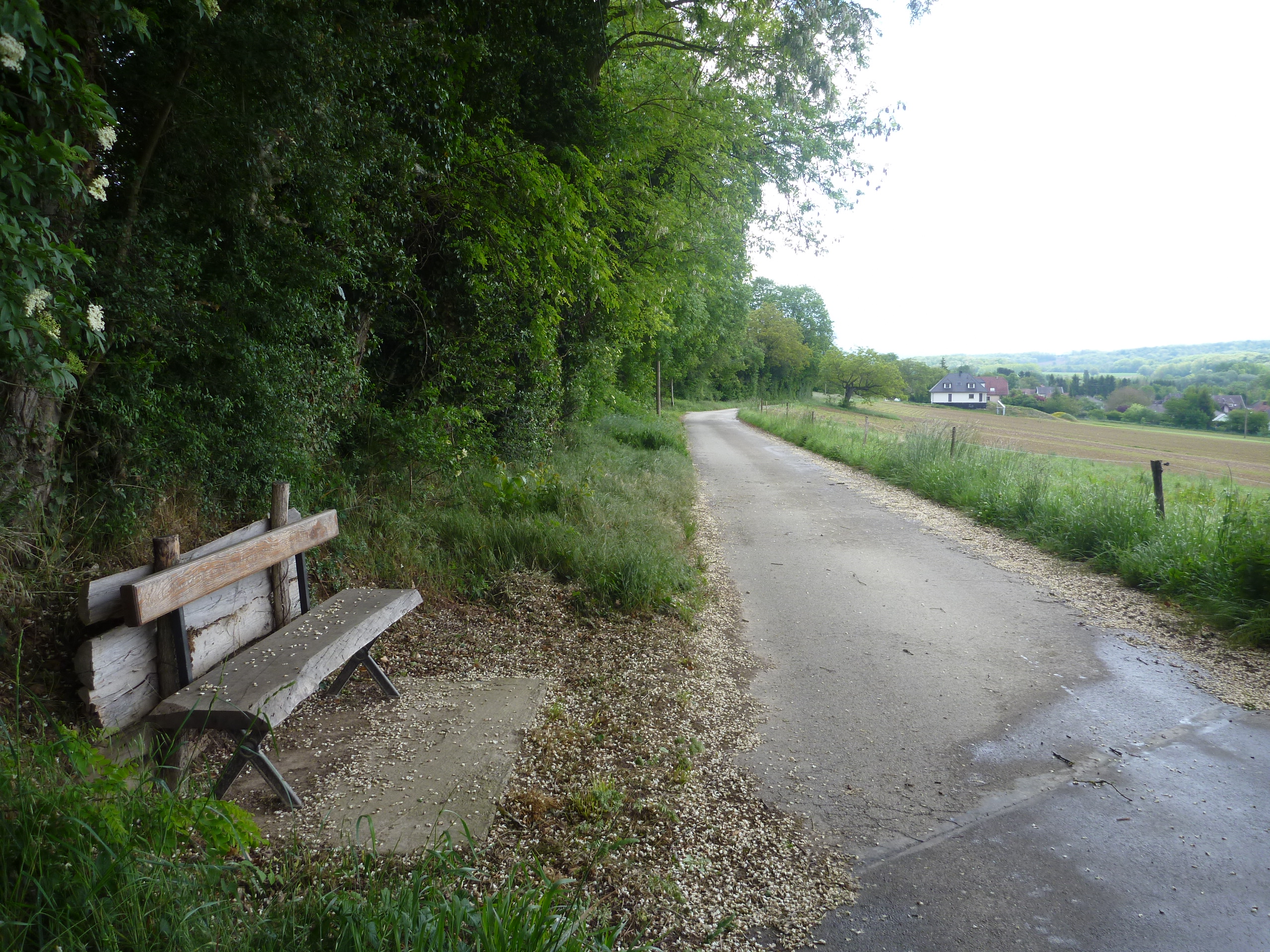 Chemin goudronné. Banc. Champ et maison en arrière plan.