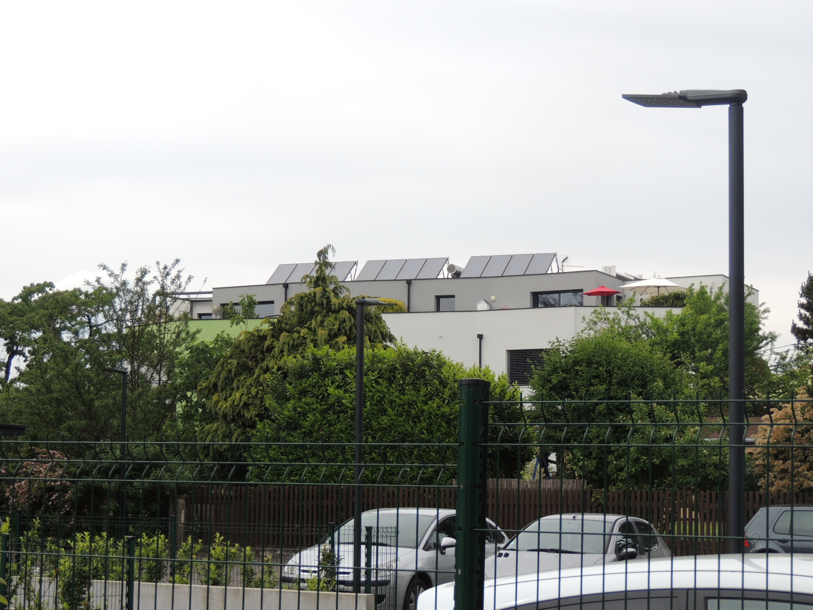 Immeubles. Jardins. Végétation. Parking.
