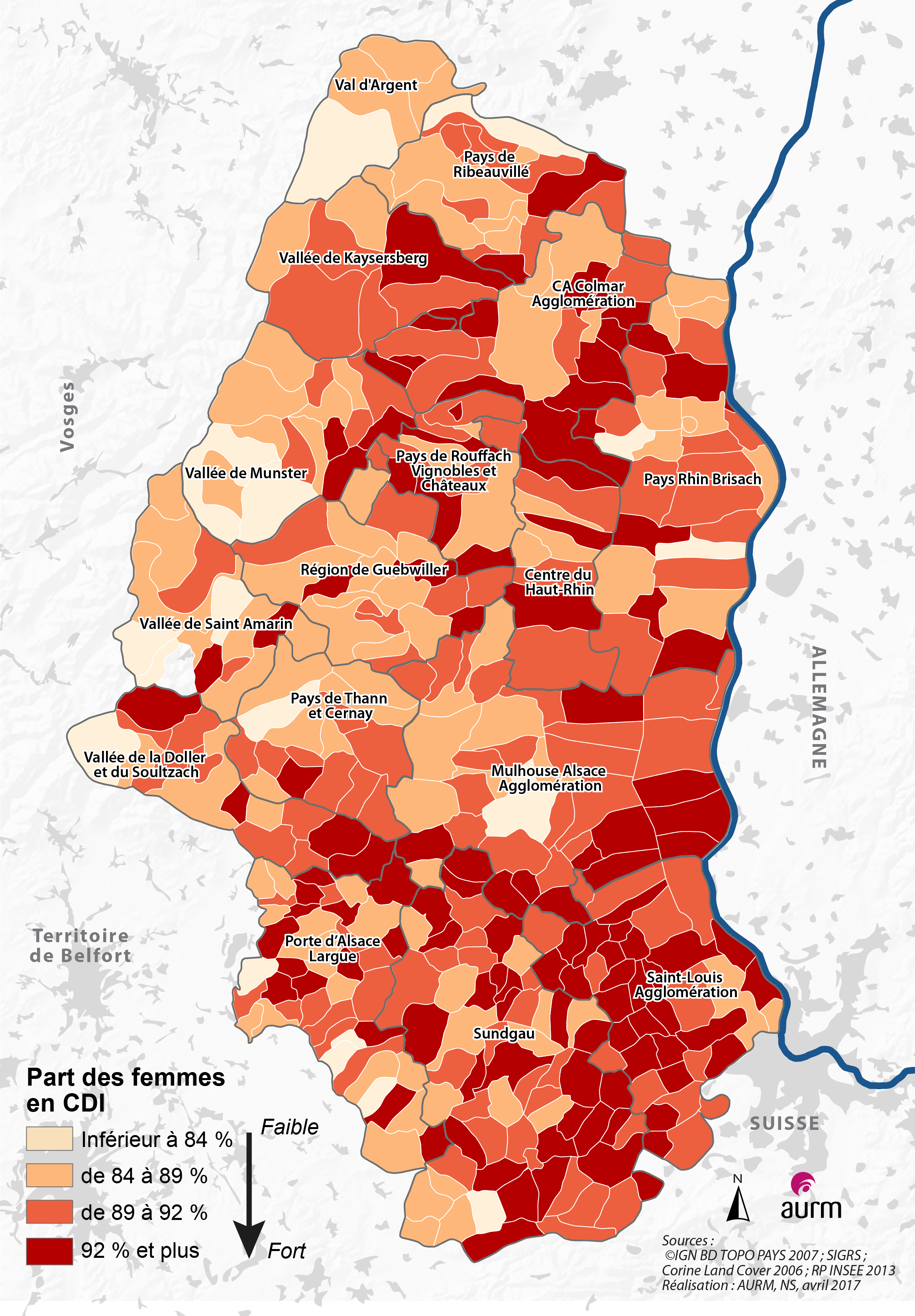La part des femmes en CDI dans le Haut-Rhin à l'échelle communale en 2013 (Sources INSEE)