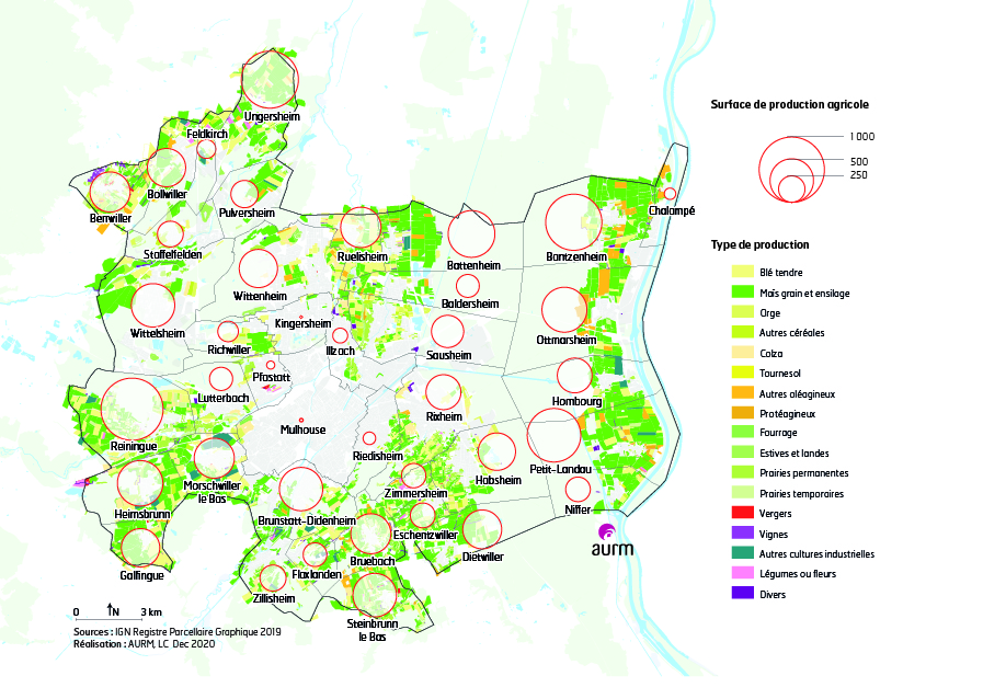 Chiffres clés et répartition des surfaces agricoles de la région mulhousienne.