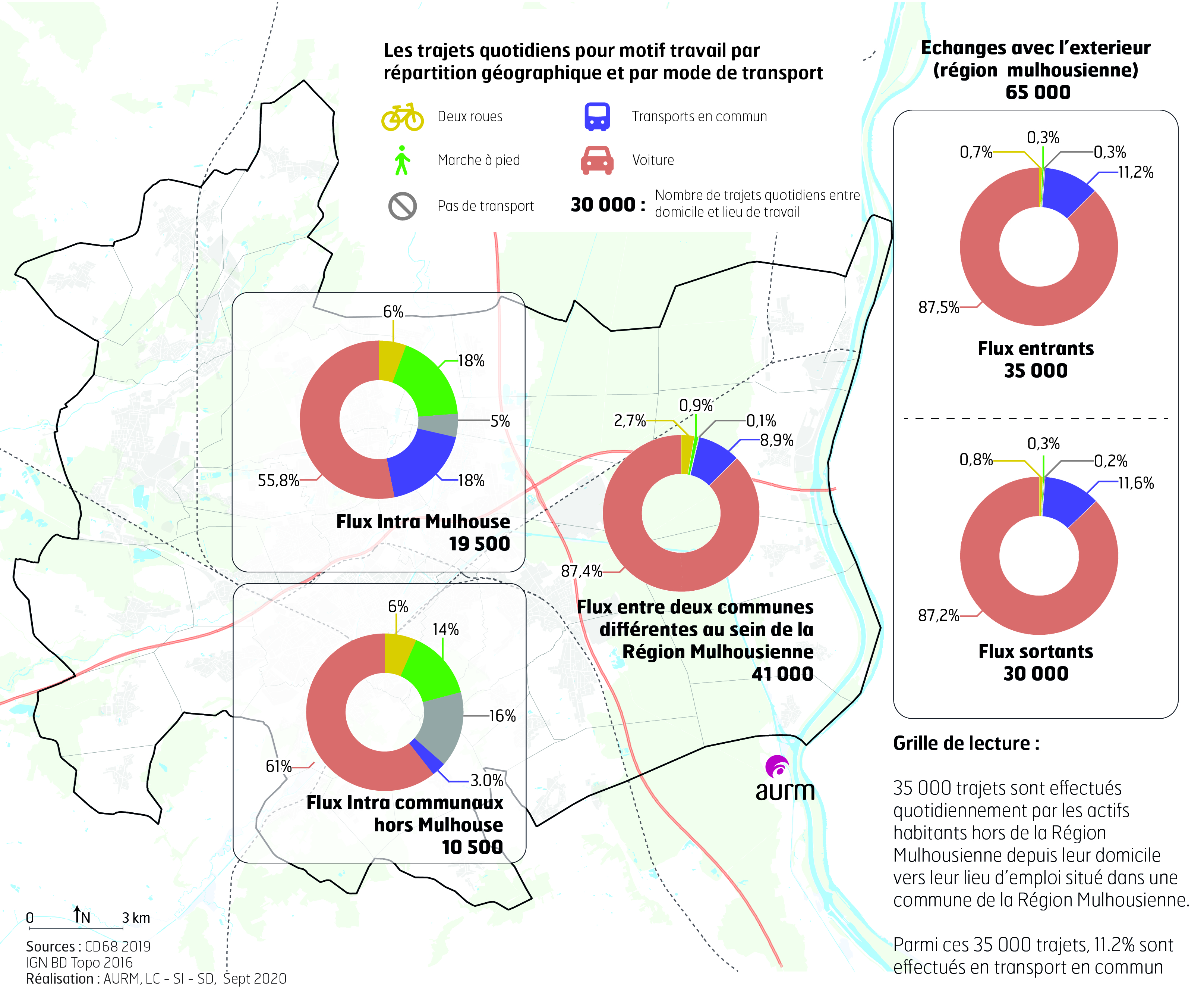 Cartographie des trajets effectués quotidiennement par les actifs dans la région mulhousienne.
