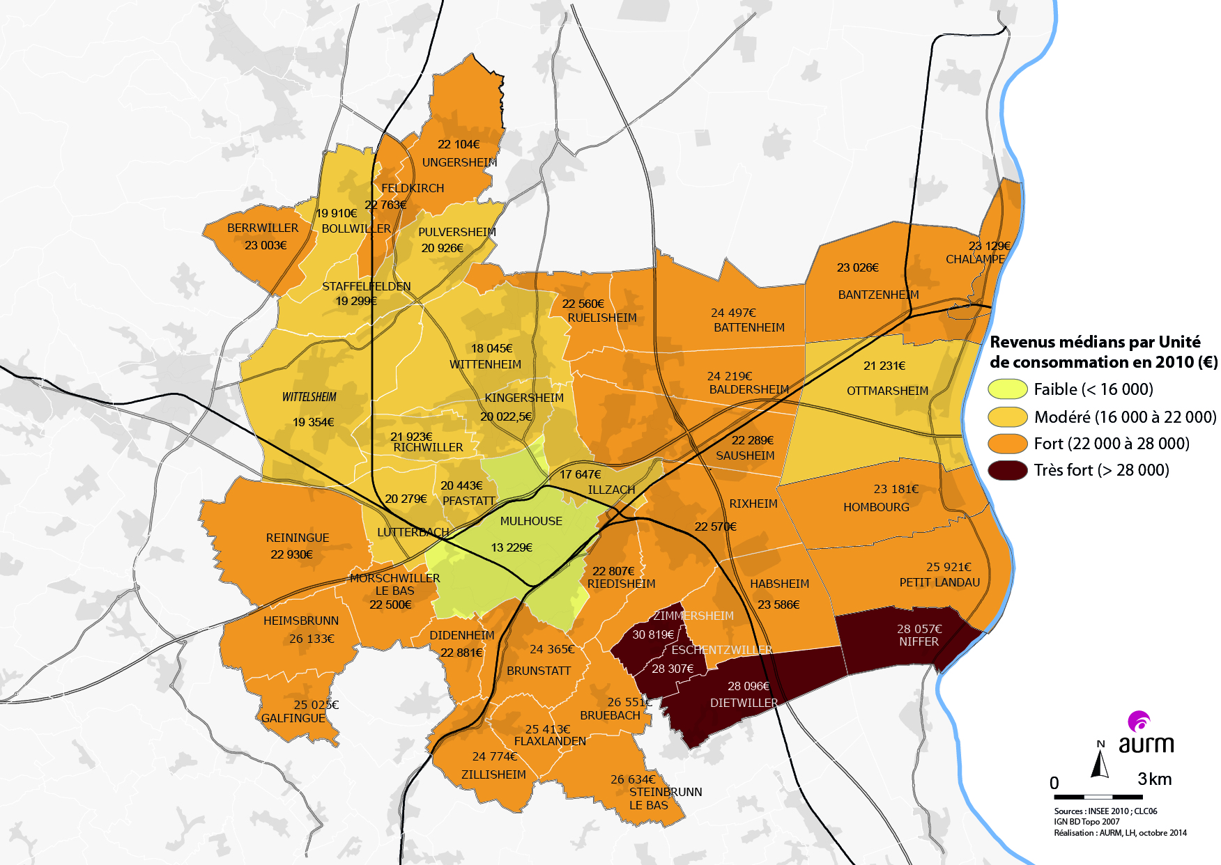Revenus médians par Unité de consommation en 2010 - région mulhousienne