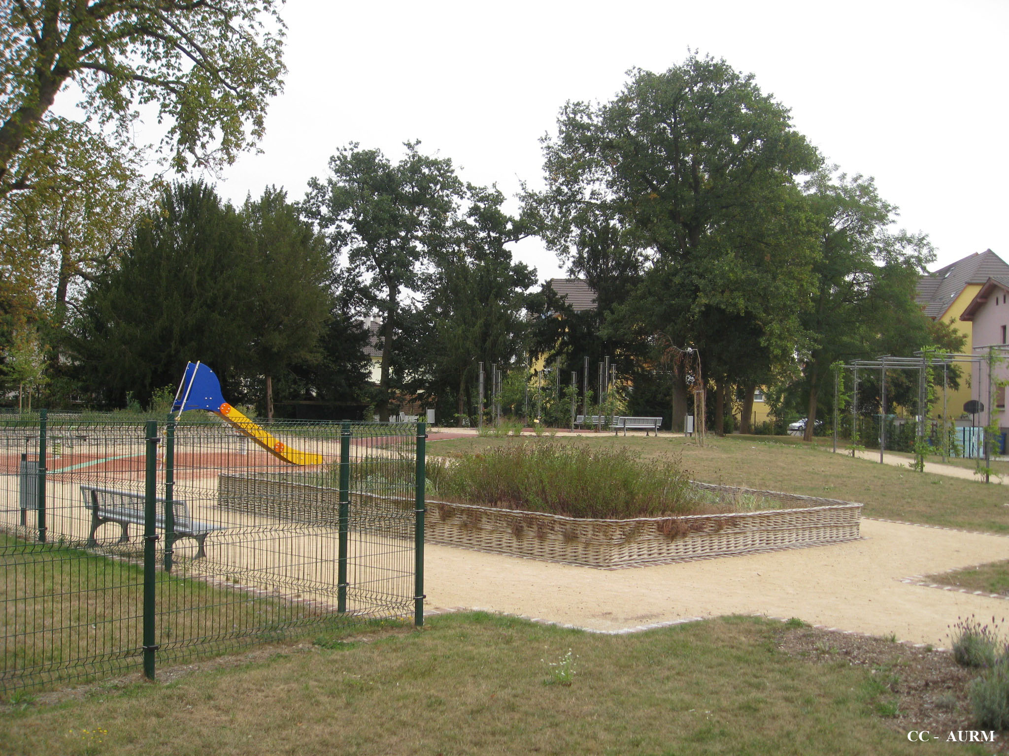 espace vert. arbre. banc. toboggan. grillage.