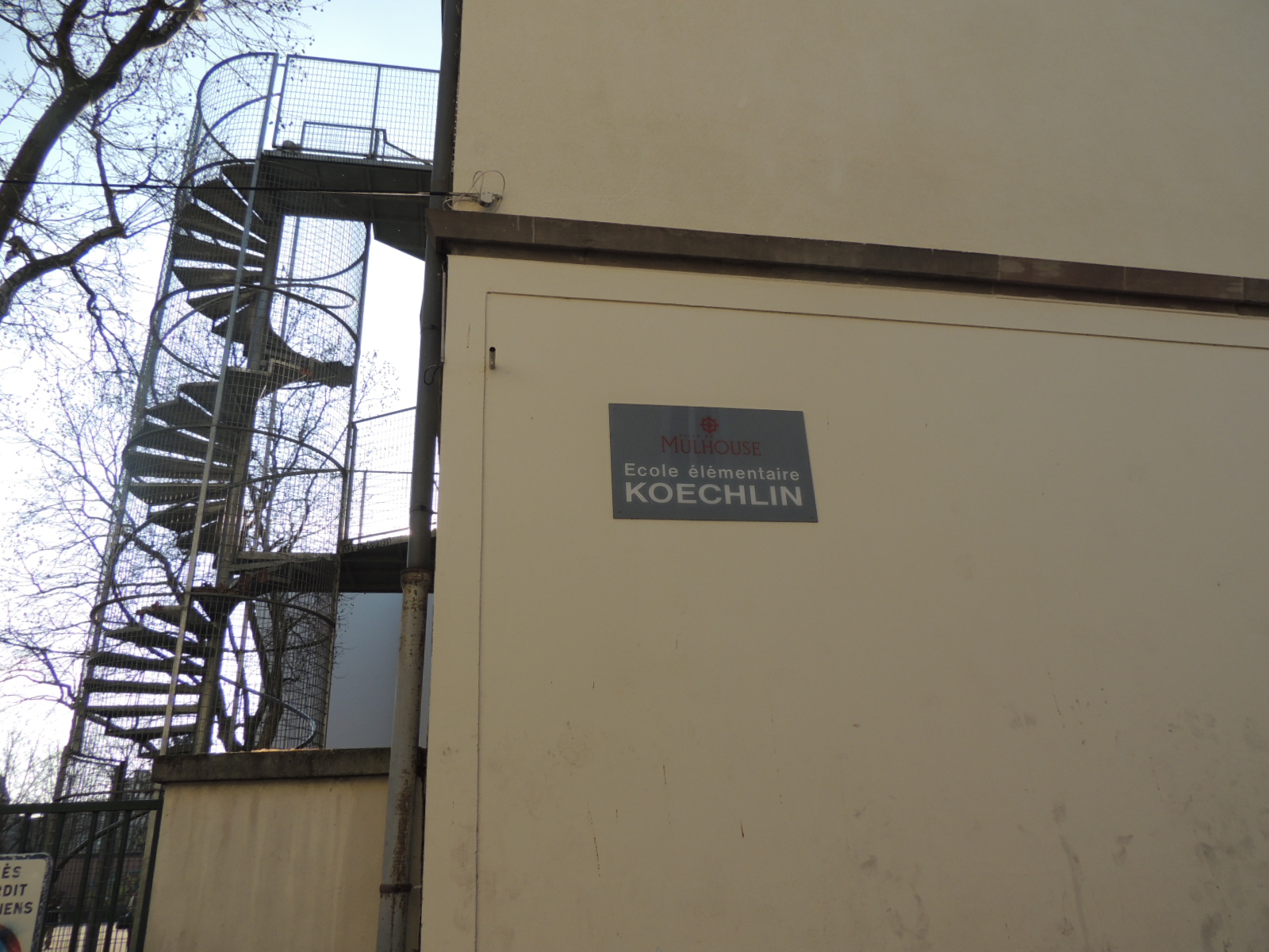 Escalier de secours. Plaque indiquant le nom de l'école.