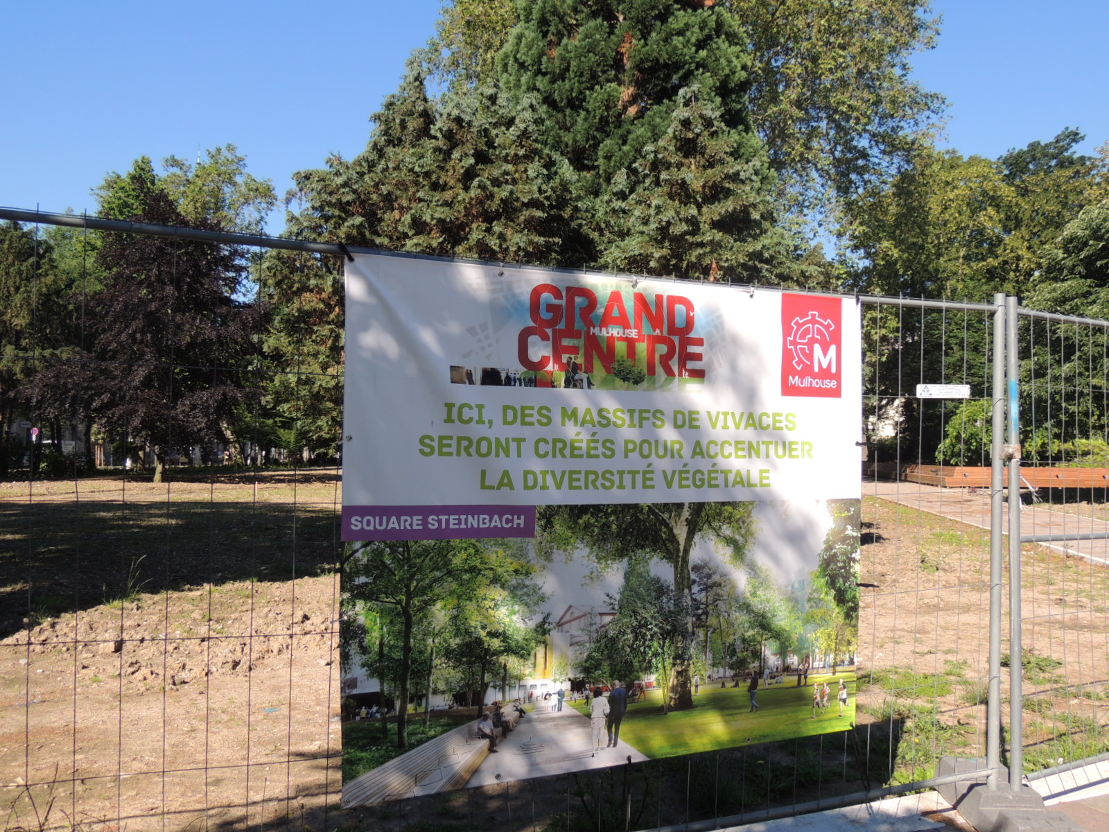 Travaux d'aménagement du parc. Panneau indiquant la plantation future de massifs de plantes vivaces.