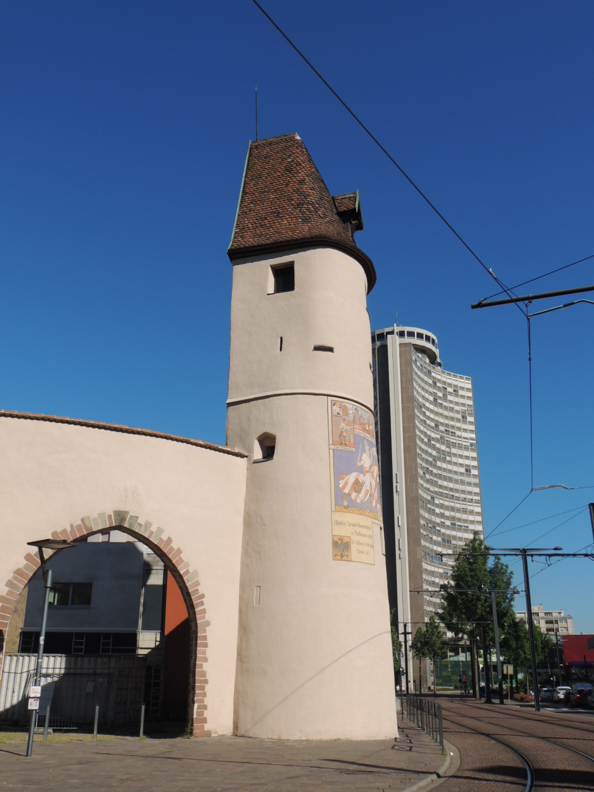 Ancienne partie des remparts de la ville de Mulhouse. Fresque représentant Ulrich de Dornach visible.
