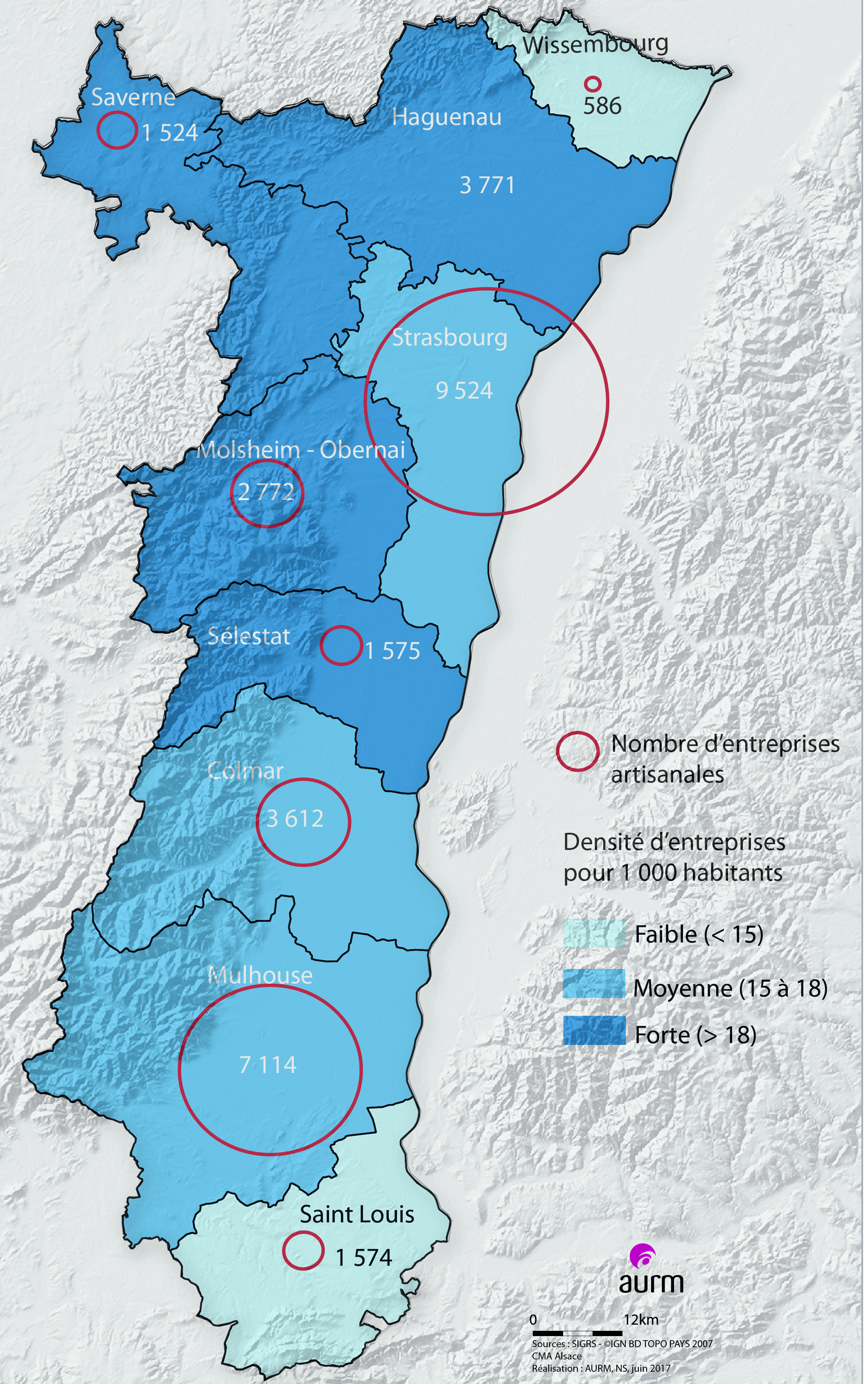 Nombre d'entreprises artisanales en Alsace, par zone d'emploi, au 1er janvier 2017. Densité d'entreprises pour 1000 habitants, par zone d'emploi